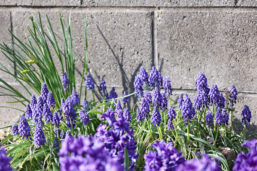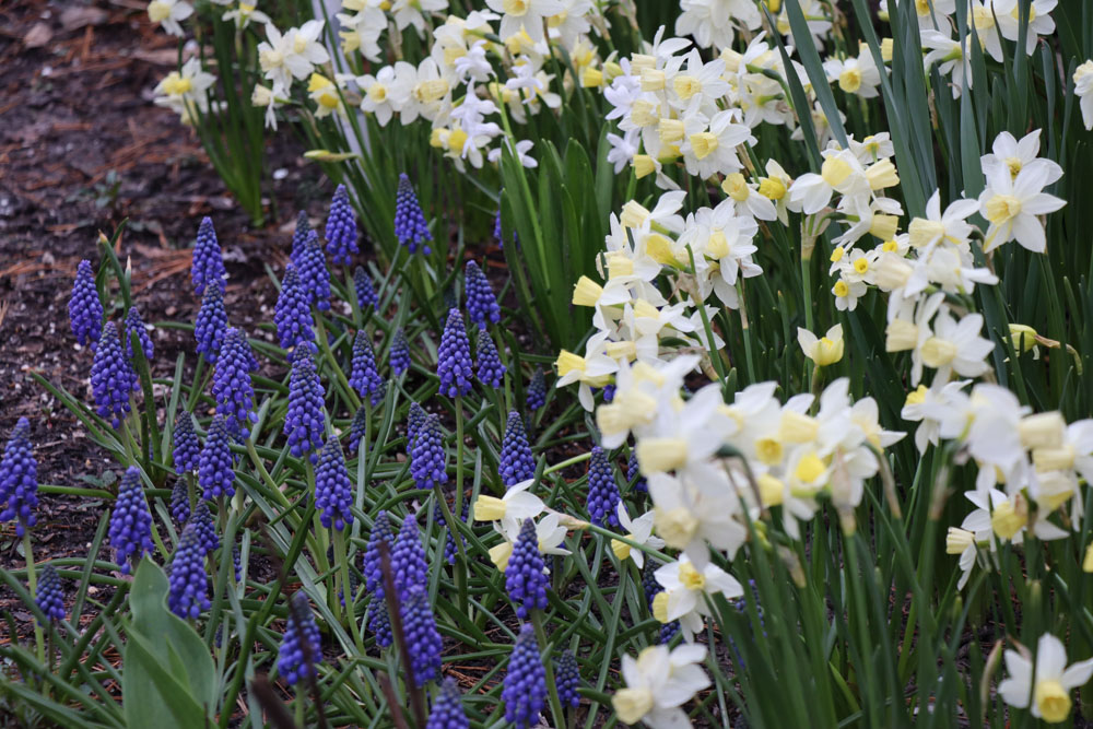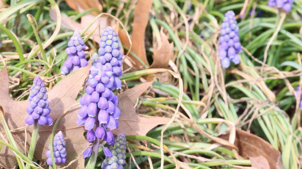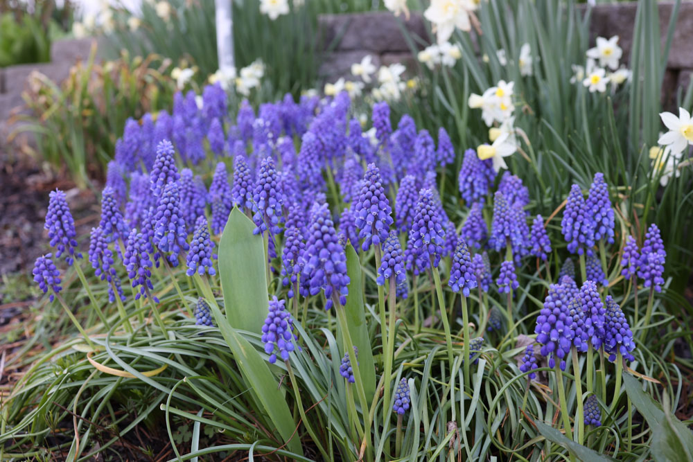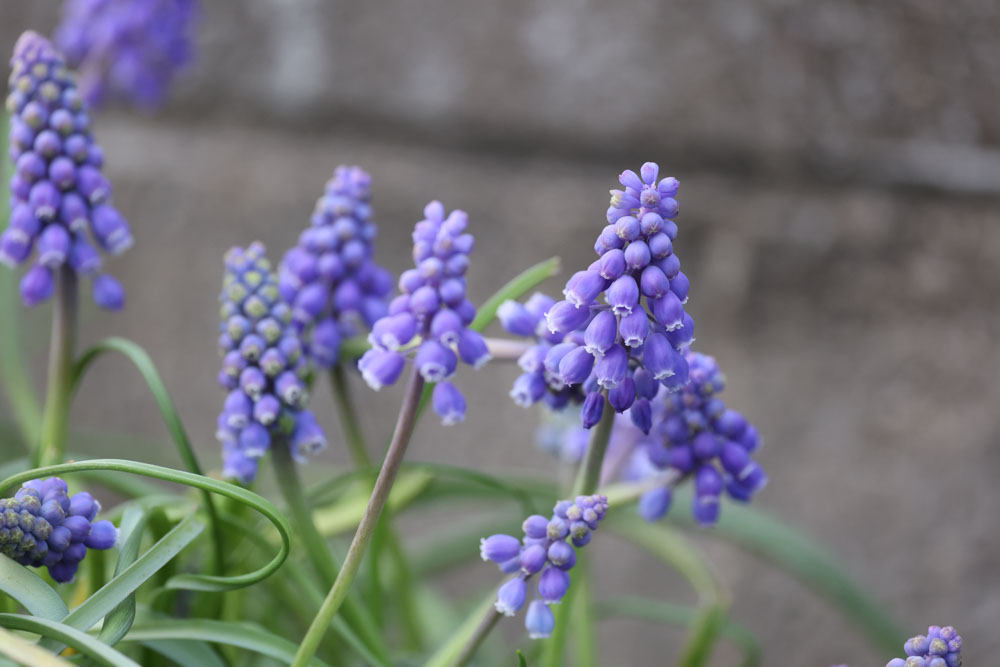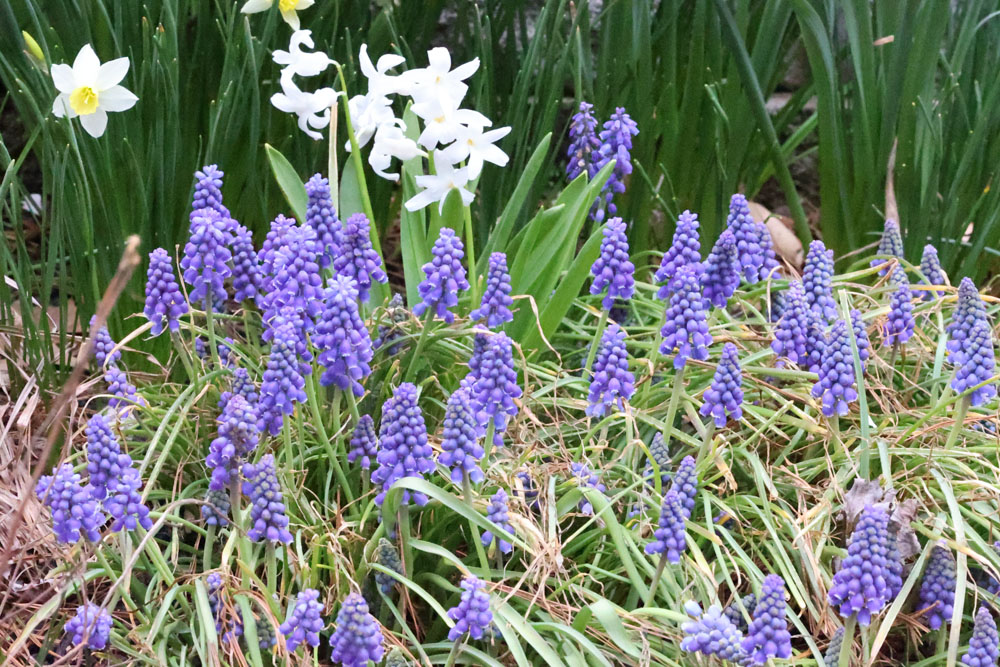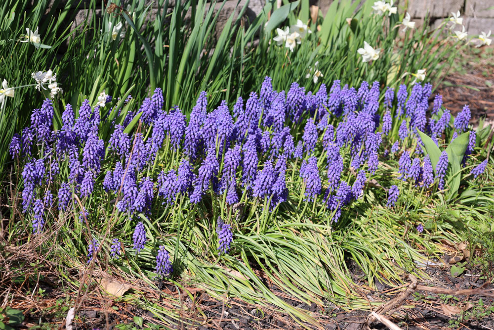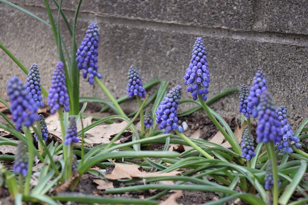 Unlike the true Hyacinths, Grape Hyacinths are smaller, have floppy (not firm) leaves, and have 4 to 8 flower stems (not just one). Each long, leafless flower stalk comes directly from the root, which is called a scape. Each scape has 20 to 40 individual little bell-shaped florets. The lower florets bloom first and as they wither, the upper ones open up. I love the vibrant purple of these flowers. They are certainly showy.
