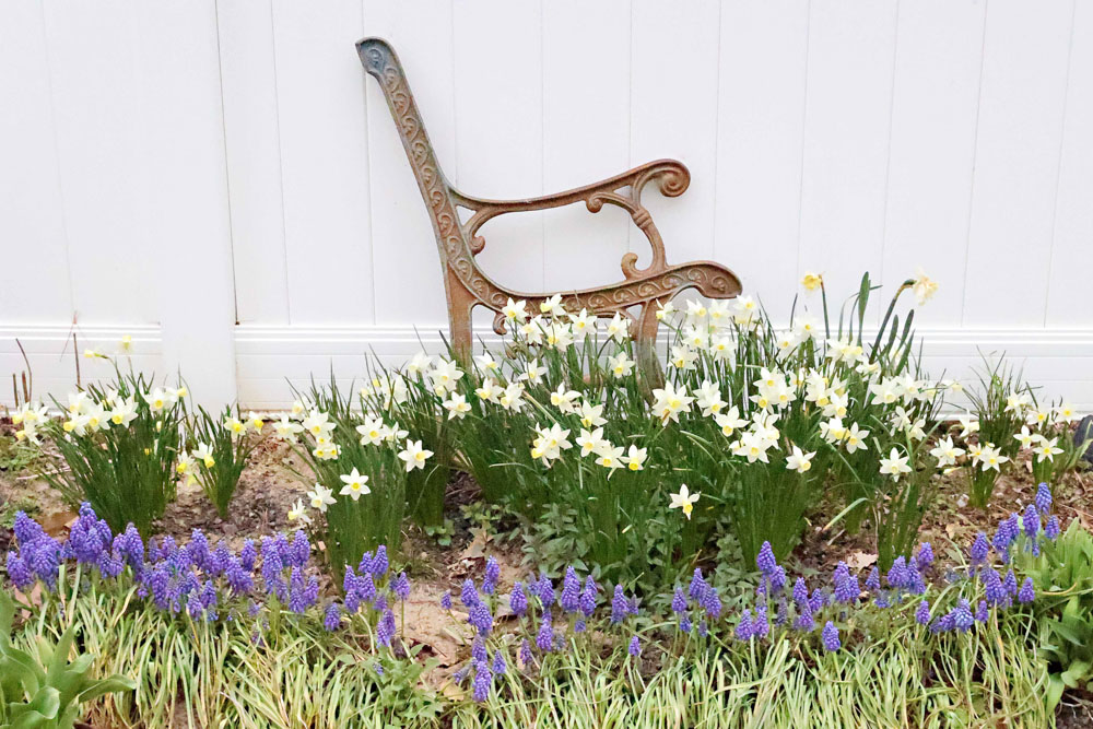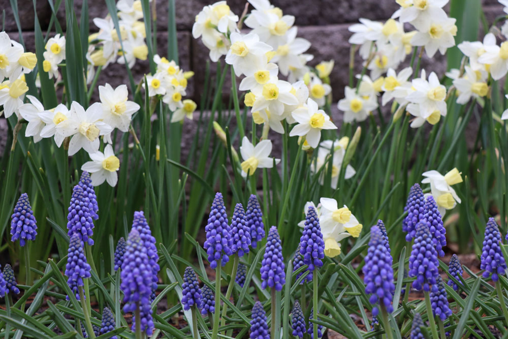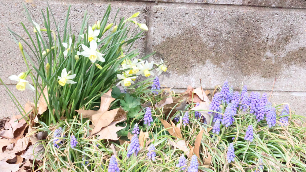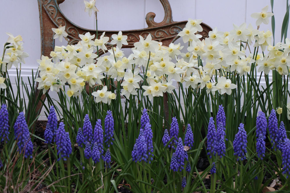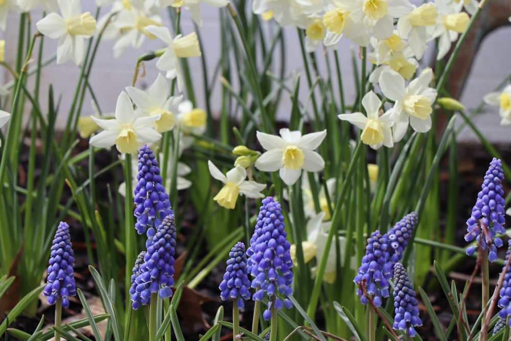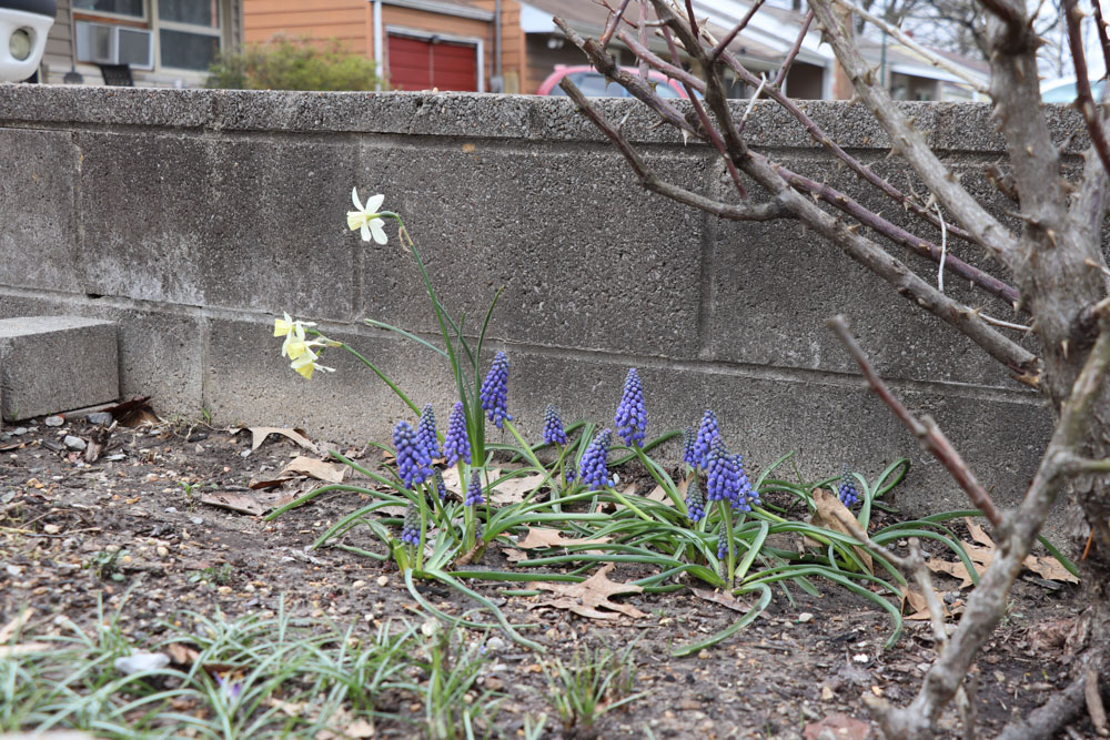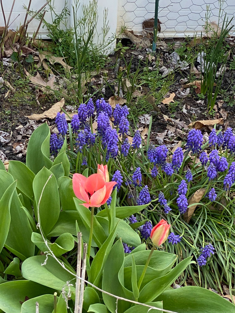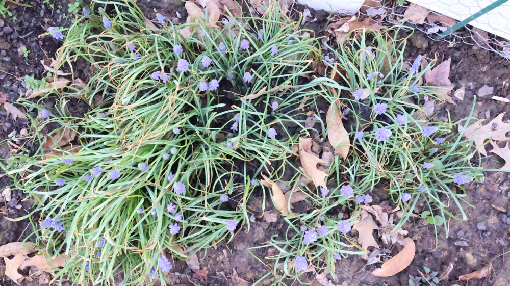 Unlike the true Hyacinths, Grape Hyacinths are smaller, have floppy (not firm) leaves, and have 4 to 8 flower stems (not just one). Each long, leafless flower stalk comes directly from the root, which is called a scape. Each scape has 20 to 40 individual little bell-shaped florets. The lower florets bloom first and as they wither, the upper ones open up. I love the vibrant purple of these flowers. They are certainly showy.