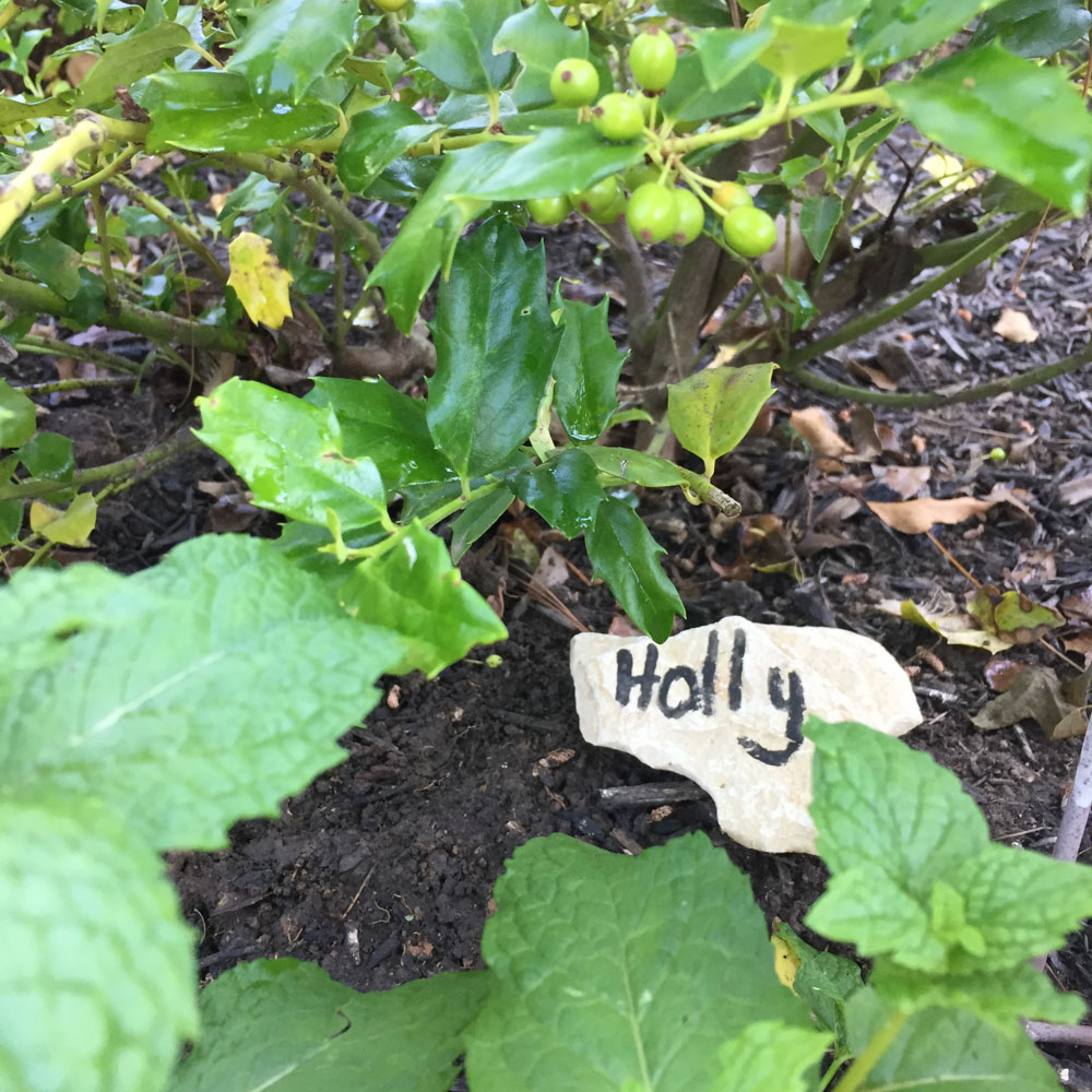 The tag says "A male and female plant are grown along-side each other to insure prolific berry production. These fast growing selections have a sense, upright, and rounded form. Shiny green foliage sets off the heavy berrys."