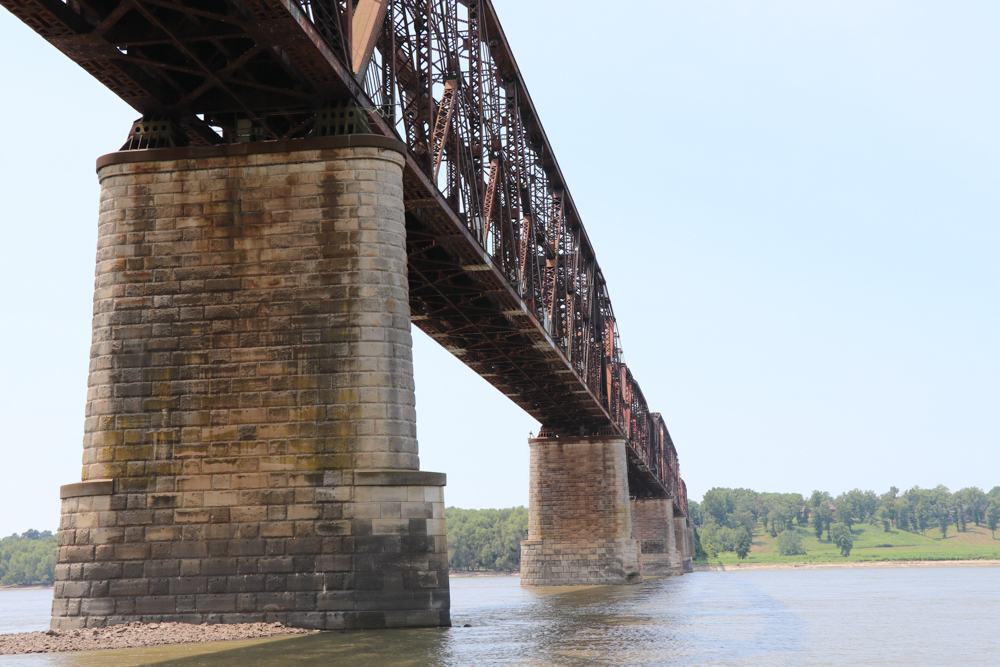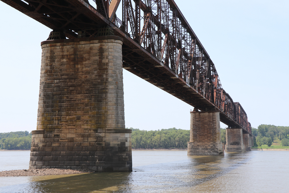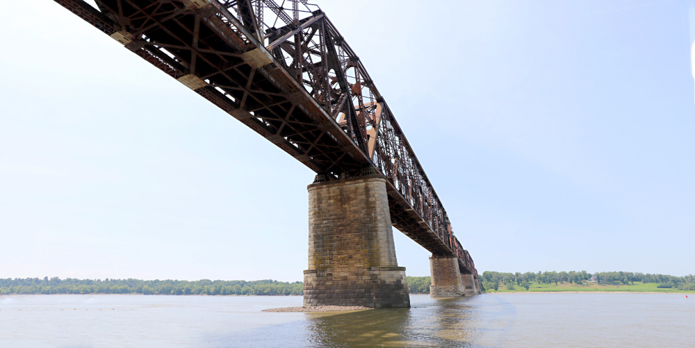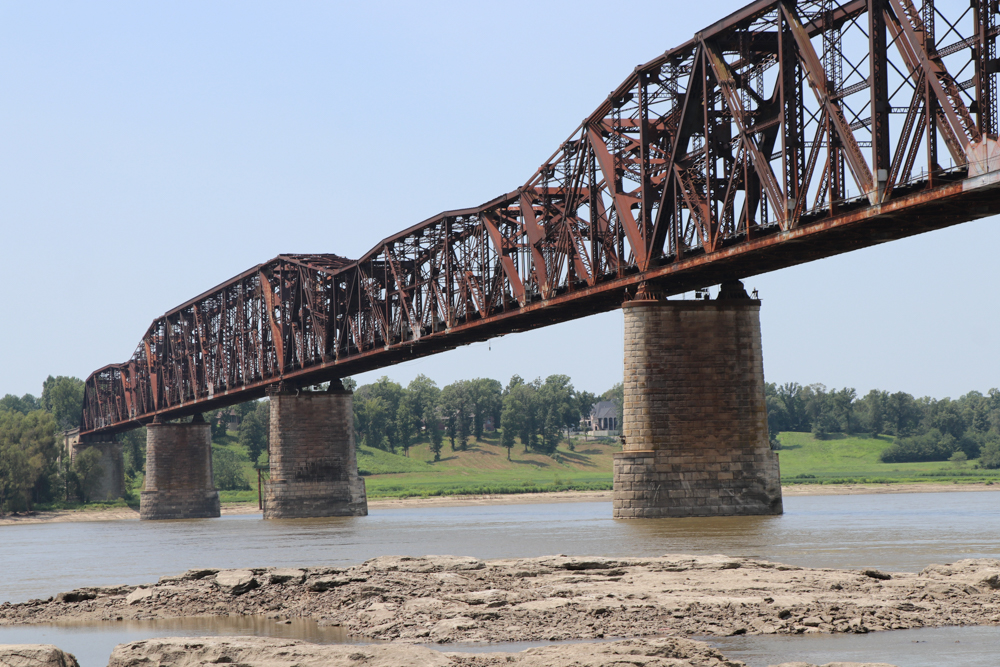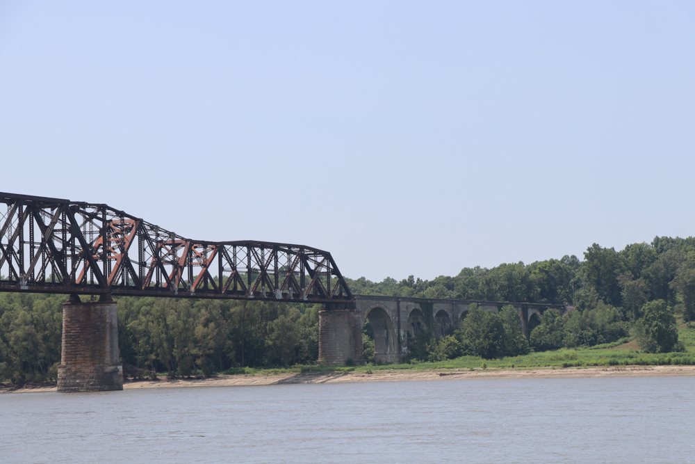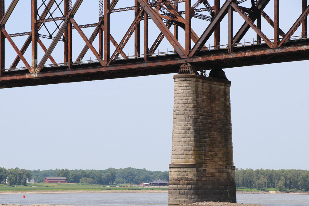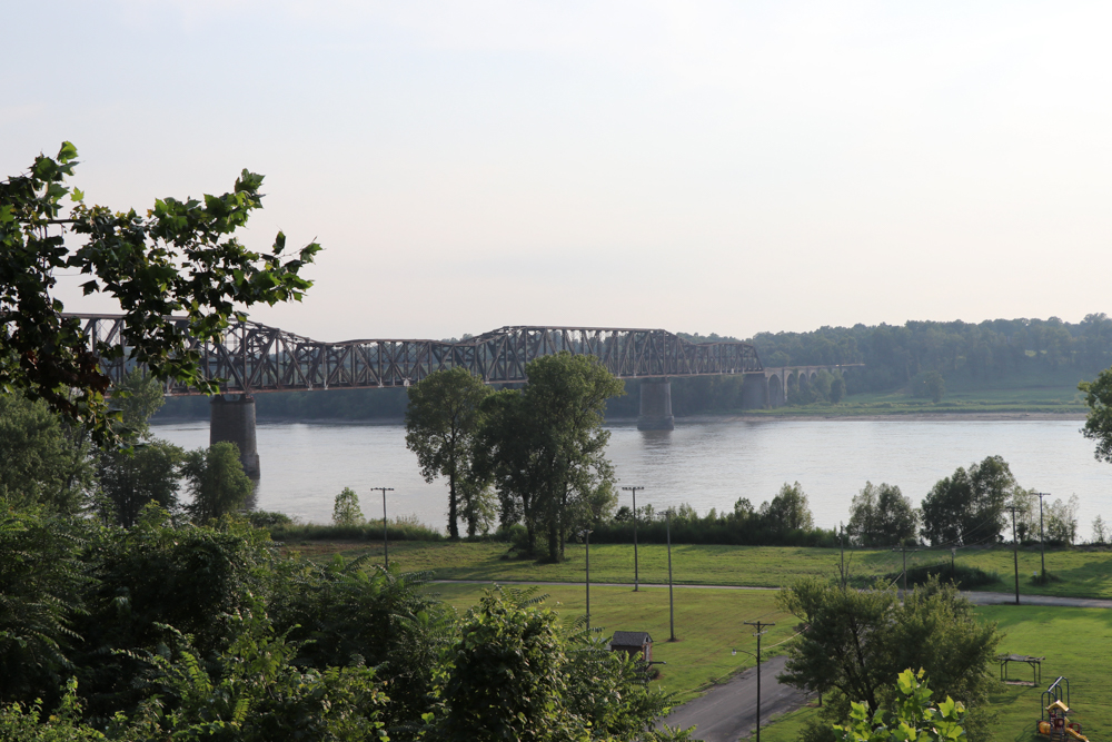 The Thebes Bridge is along the Mississippi River. Directly across from Thebes you can see the The Riverhouse wine place in Scott City, Missouri. You can sit at the winery in Missouri and watch the trains cross the bridge which is kind of awesome.