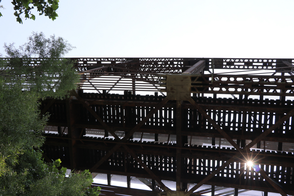 Thebes Bridge opened for rail traffic in 1905 and is still in use today. When the river is low enough, you can walk along the banks all the way down and under the bridge.
