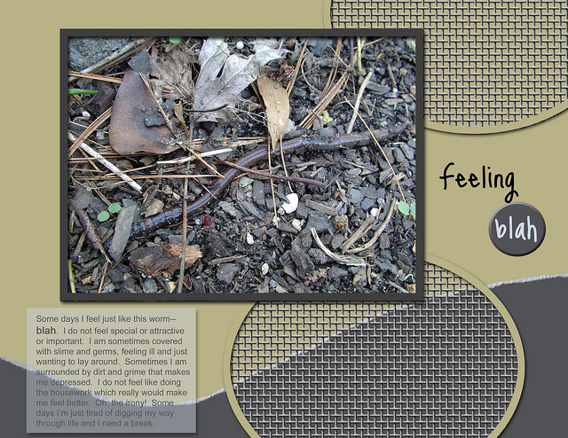 This journaling references "digging my way through life" and needing a break. This worm digs through life every day and is sort of just there, blah, covered in slime. Sometimes life is like that for me where I am covered with the slime of life, always having to fight hear with perseverance to get through every little task.