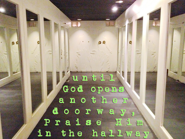 6.27.13 Arrow Prayer: Lord, when I rounded the corner and looked down this hallway in this photo, I was surprised by the mirrors and and that it seemed to go no where and it made me think about how this often relates to my life. I often round the corner of my journey with You and all I can see is the reflection of life going by me and it seems I am going nowhere and I do not know where to go next. How awesome that You are always there for me, no matter the situation, and You know my path and journey and what doors will be opened for me in the future and I can just trust in You. Thank you for allowing me to lean on You! I praise You in the hallways of life when the unknown is scary for You are my Rock and Salvation that I lean on.