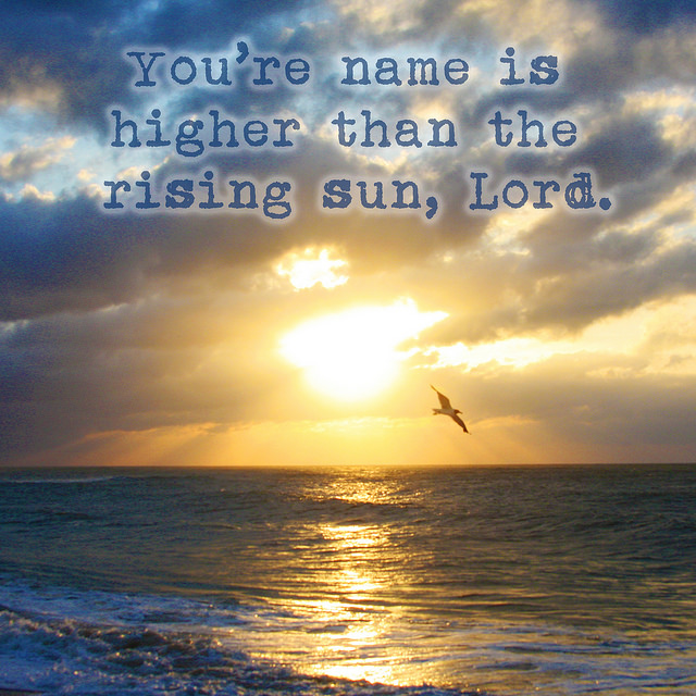 7.21.15 Lord, I praise Your name, for Your name alone is exalted, Your majesty is above earth and heaven. Psalm 148.13. O LORD, our Lord, how majestic is your name in all the earth! You have set your glory above the heavens. Psalm 8:1 From the rising of the sun to its setting, the name of the LORD is to be praised! Psalm 113:3 Lord, thank You today, for Your Word which gives me better prayers to lift up to you than I could ever express in my own words.