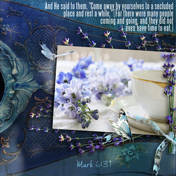 I am studying all the details from the matching purple flowers in front of the photo to the ones that the photo is resting on behind, making the photo just meld into and become realistic. I spy the butterflies so realistic as if they are actually fluttering about the photo. I absolutely love the teals and purples together! I love the contrast of the hard texture in the background with the bright photo.