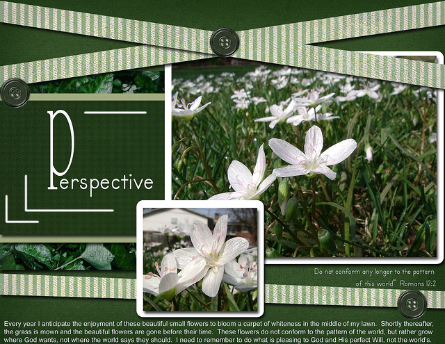 Continuing with sharing some of my older garden analogy layouts, this one is on perspective. I have to bend down with my head in the grass to take a photo of these tiny flowers or even to just enjoy them. They are weeds that do not conform to the pattern of this human world, but rather grow where God wants them, not where the world says they should.