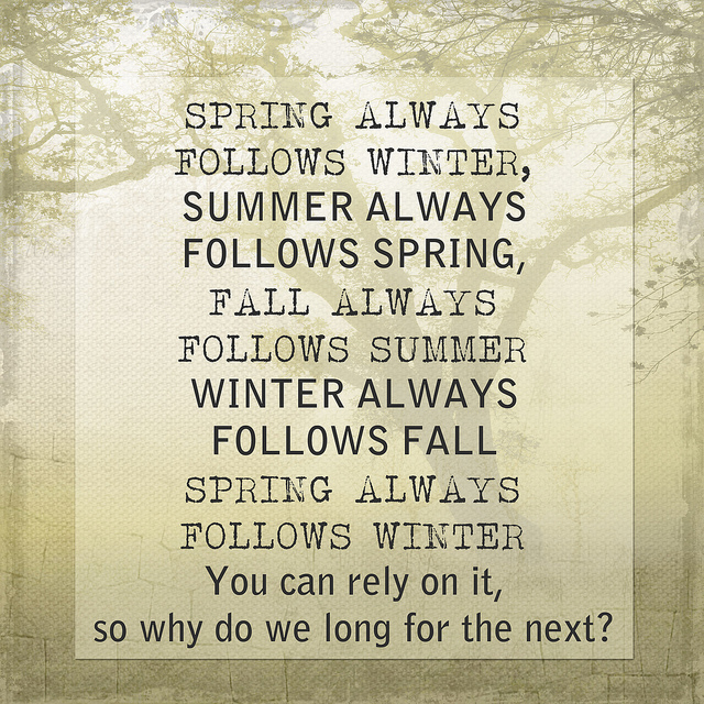 Arrow Prayer 4.13.13 Lord, I suffer from cabin fever every year and it seems to take so long for Spring to get here. I long for those perfect days and when they get here, I feel so blessed, but then they are gone so fast. I often wonder why I spend so much time wishing my days away. Help me to be thankful by the weather every day, regardless of the temperature, the winds, sunny or cloudy, rainy or snowy, or just plain dreary, and live with appreciation in the moment.