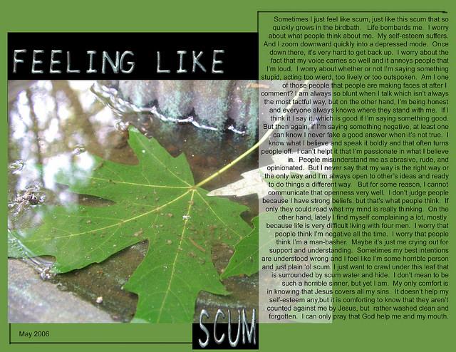 I am once again sharing an old layout of mine from my garden analogy collection. This one is a tough one to share because it is so transparent. I believe this layout wins the award for the most read layout of all I have created. It always brings a lot of comments and reactions. Is it because people can identify with it? (it's okay if you do.) Is it because they feel sad for me? (Even I read it and feel sad for me, yet at the same time feel the way I do in this layout repeatedly from time to time.) Is it because they want to post to "fix" me? (please do not try to fix me, I do not need fixing, I've got Jesus.) My hope would be that people would read all the way down to the last sentences and find comfort, especially if they are identifying with me. They key is that I do not stay in a scum-covered world. Jesus removes that scum, that sin, over and over and over as many times as needed.
