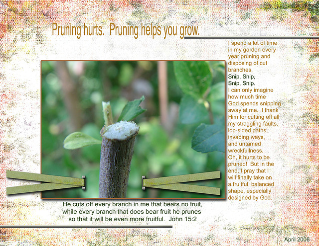 Many of you know me well and know that I love my flower garden and I love analogies, so when the two come together, I find enjoyment. Here is a layout I made in April 2006 of a photo I took in the yard while trimming with some journaling. Jesus used analogies from the garden too!