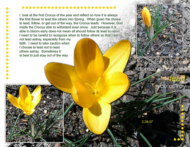 In sharing an old garden analogy that I made in 2007, I enjoy reading my own thoughts. My husband and I had this discussion back in January and I actually have a graphic for a draft blog post I never wrote on this topic of leading and following, so maybe I will take time to write it now. The thought that comes from this old layout however, is to be careful when you do follow, not to be lead astray.