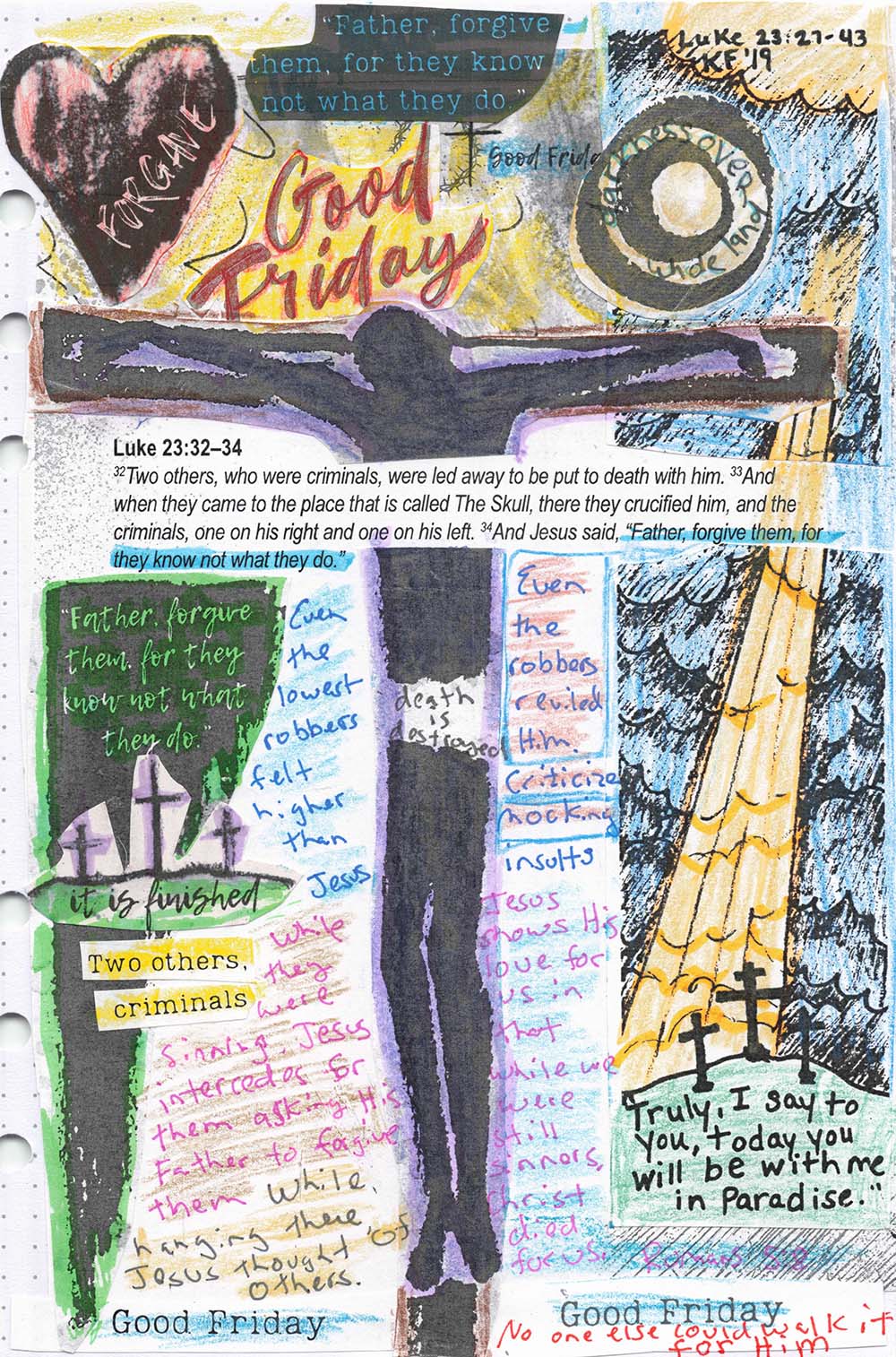 Someone (no name) ran (as in went fast to wherever) to get a sponge full of sour wine (a common drink at the time) and used a reed to lift it high to Jesus's mouth to drink and while doing so said that Jesus should wait for Elijah to come and save Him. This person made such a great effort by running somewhere to get the sponge-filled drink on a stick. What an attention-getting kindness. At first I read this as mocking Jesus, but upon a reread I see it is more like a compassionate person giving someone else a bit of hope to "give it a little more time and it will get better." This person ran so he was in a hurry which seems to me like he thought Jesus was about to die of dehydration and wanted to give him a little more liquid so Jesus could hold on a little longer while waiting for Elijah to save him. Luke indicates the man made the comment, but Matthew 27:49 says that "others said, “Wait, let us see whether Elijah will come to save him," which seems to be more mocking. Maybe the man said it with kindness and others repeated it as mocking. Really? Jesus is almost dead and they have to continue their hate until the very last moment? It seemed hard enough to look at, much less to continue to contribute to the pain.