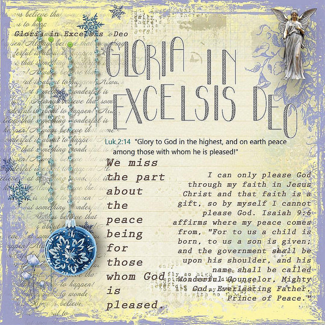 Verse 14 is now a hymn called Gloria in Excelsis Deo which is the Latin translation of the first words. The angels praise God in heaven and announcing the blessing of peace on earth among those with whom He is pleased. Joy to the world, the Lord is come! (verse 10) Hard! The herald angels sing (verse 14) We sing at Christmas "peace on earth and goodwill to men," but unless we pull out our Bibles we miss the part about the peace being for those whom God is pleased. I can only please God through my faith in Jesus Christ and that faith is a gift, so by myself I cannot please God. Isaiah 9:6 affirms where my peace comes from, "For to us a child is born, to us a son is given; and the government shall be upon his shoulder, and his name shall be called Wonderful Counselor, Mighty God, Everlasting Father, Prince of Peace."