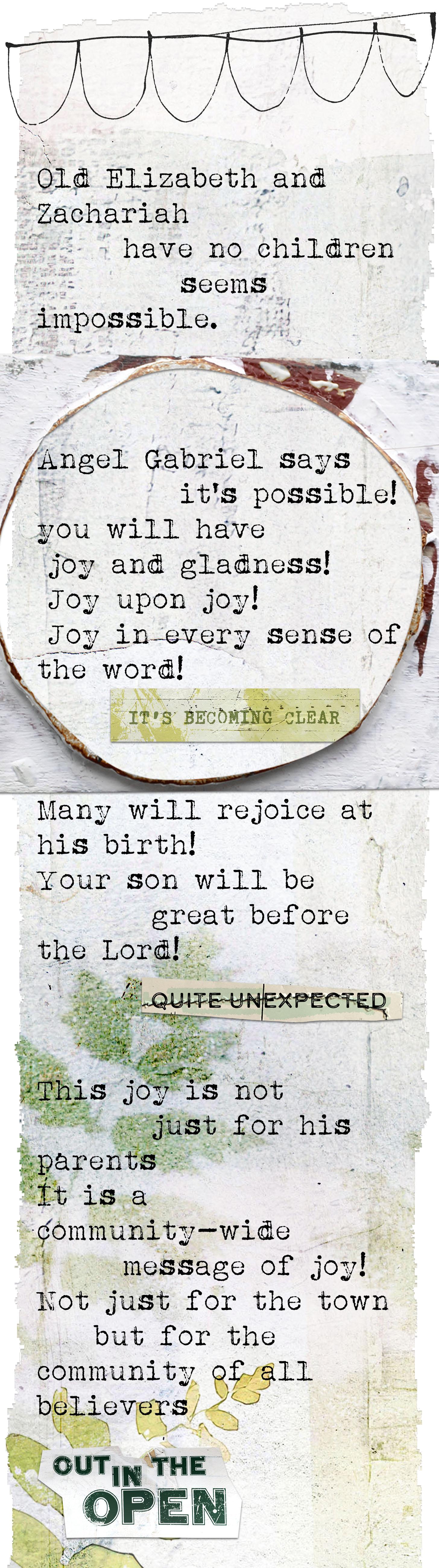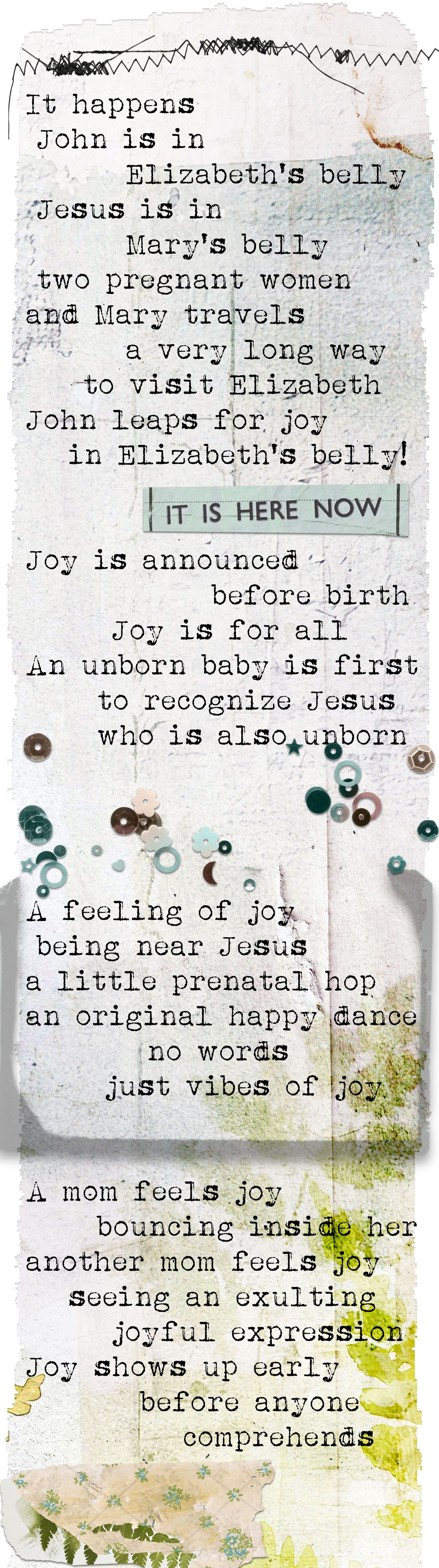 The first verse in this study of JOY is about the angel Gabriel foretelling the birth of John the Baptist to his father Zechariah, and the second verse is about baby John in the womb of his mother Elizabeth when Mary arrives to visit with the baby Jesus in her womb. John leaps for JOY. Both verses are about John the Baptist.
