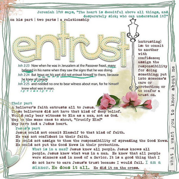 While Jesus was at the Passover Feast, which lasted 7 or 8 days, many believed in Him after seeing signs. This scripture does not tell us what those signs were. Perhaps He did other miracles than those recorded in Scripture. Verse 24 includes the words "on His part," which indicates there are two parts to entrusting. There are two parts to a relationship. A believer's faith entrusts all to Jesus. I do not think these believer's had that kind of deep belief. The definition of "entrusting" is: to commit to another with confidence; assign the responsibility for doing something; put into someone's care or protection; or to confer a trust on. Verse 24 says "did not entrust Himself to them." On the opposite spectrum, Jesus entrusted Himself to His disciples as they walked with Him. The people's belief was weak in that Jesus could not commit Himself to that kind of faith. He was not confident in their faith. He could not assign to them the responsibility of spreading the Good News. These people would only bear witness to Him as a man, not as God. He could not put the Good News in their protection. Jesus knew all people. Jesus knows all people. Jesus knew what was in a man. What is in a man? He knew that all people were sinners and in need of a Savior. It is a good thing that I do not have to earn Jesus's trust because I would fail. He does it all. He did it on the cross. Jeremiah 17:9 says, "The heart is deceitful above all things, and desperately sick; who can understand it?" Jesus can understand it. Jesus knows the heart is not trustworthy. Jesus knew that some of these people who believed now would be the same ones to shout, "Crucify Him!" These people may have had a Judas heart. Jesus is omniscient (all knowing).