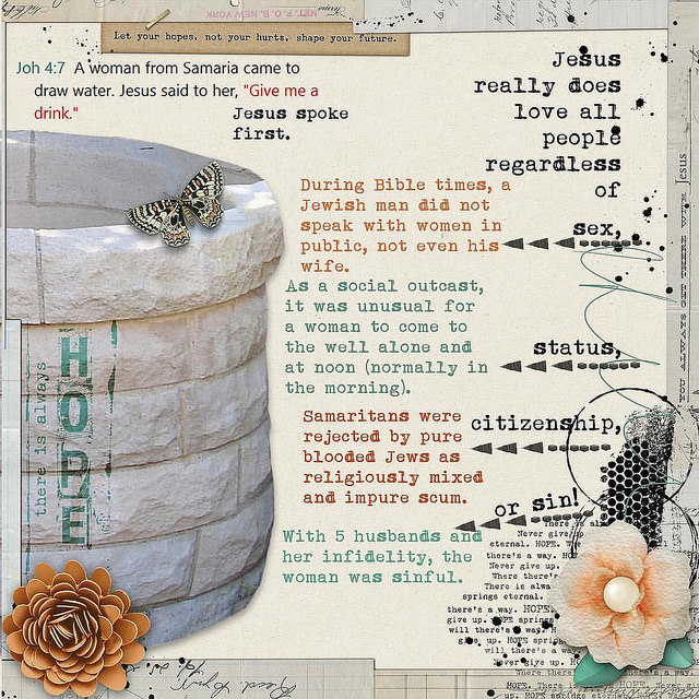 Jesus's disciples left him and went to town to buy food and a Samaritan woman came to the well. The well was usually outside the city on the main road. It was unusual for a woman to come to the well alone and at noon (normally in the morning). Did she come at this time alone because she was a social outcast within the Samaritans? Jesus speaks first and asks her for a drink. The woman was taken aback because she never expected Jesus to associate with her, exclaiming such. During Bible times, a Jewish man did not speak with women in public, not even his wife. As a woman, an outcast in society, a Samaritan, and, as we see below, full of infidelity, with four strikes and your out, it was a shocker to the women that this man (Jesus) would even speak to her. Jesus really does love all people regardless of sex, status, citizenship, or sin!