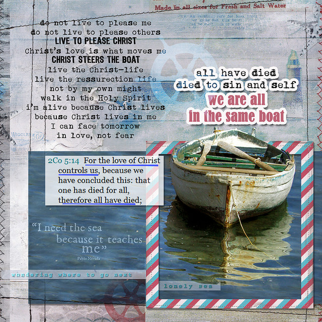 4/19/15 I had no idea where I would start this image, needing an out of bounds for the challenge I was working on, until I read The Message version of the scripture, "Christ's love has moved me to such extremes. His love has the first and last word in everything we do. Our firm decision is to work from this focused center: One man died for everyone. That puts everyone in the same boat." Instantly it all came together. I found the boat photo on Flickr creative commons.