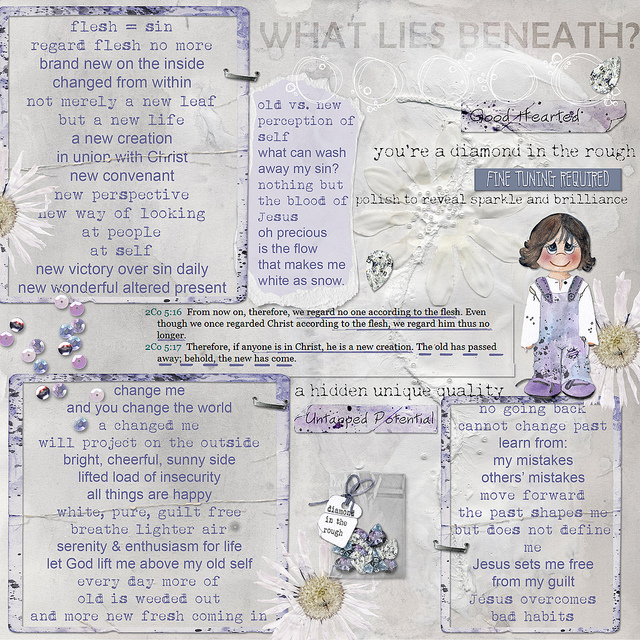2/28/15 The challenge is to utilize my tutorial on Emotions and Color (Fun Extras, Lesson 10). So I started out thinking to myself, as the challenge is to do, before I even created my layout file, what color does this verse make me feel and what color would portray that feeling. My first thought was yellow. Yellow because the new me is "fresh, cheerful, happy, and full of energy." My second thought was white for "purity" and forgiven sins.