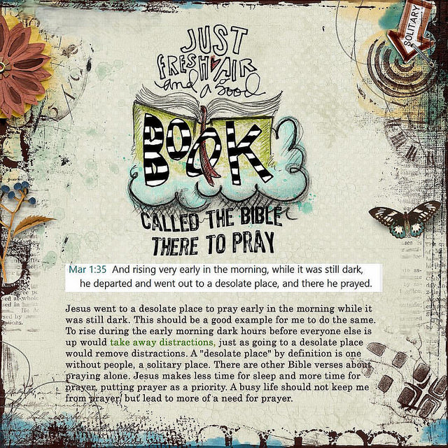 Jesus went to a desolate place to pray early in the morning while it was still dark. This should be a good example for me to do the same. To rise during the early morning dark hours before everyone else is up would take away distractions, just as going to a desolate place would remove distractions. A "desolate place" by definition is one without people, a solitary place. There are other Bible verses about praying alone. Jesus makes less time for sleep and more time for prayer, putting prayer as a priority. A busy life should not keep me from prayer, but lead to more of a need for prayer. Even Jesus took time out to keep a relationship with the Father and the Holy Spirit. My reactions to being interrupted do not match His. I find myself getting irritated and flustered, yet He just went with the flow and stayed focused on His purpose for being there.