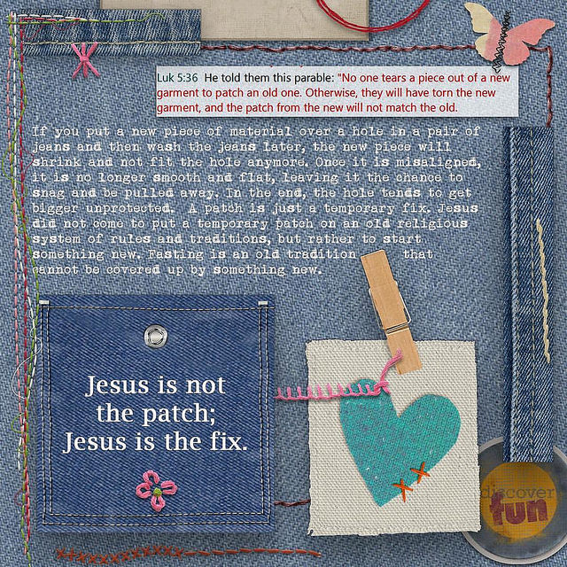 2. "No one sews a piece of unshrunk cloth on an old garment. If he does, the patch tears away from it, the new from the old, and a worse tear is made." Luke's version continues 'and the piece from the new will not match the old." Jesus is not the patch; Jesus is the fix. If you put a new piece of material over a hole in a pair of jeans and then wash the jeans later, the new piece will shrink and not fit the hole anymore. Once it is misaligned, it is no longer smooth and flat, leaving it the chance to snag and be pulled away. In the end, the hole tends to get bigger unprotected. A patch is just a temporary fix. Jesus did not come to put a temporary patch on an old religious system of rules and traditions, but rather to start something new. Fasting is an old tradition that cannot be covered up by something new.