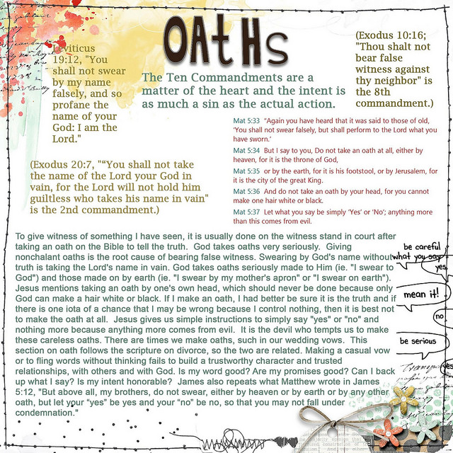 God takes oaths seriously made to Him (ie. "I swear to God") and those made on by earth (ie. "I swear by my mother's apron" or "I swear on earth"). Jesus mentions taking an oath by one's own head, which should never be done because only God can make a hair white or black. If I make an oath, I had better be sure it is the truth and if there is one iota of a chance that I may be wrong because I control nothing, then it is best not to make the oath at all. Jesus gives us simple instructions to simply say "yes" or "no" and nothing more because anything more comes from evil. It is the devil who tempts us to make these careless oaths. There are times we make oaths, such in our wedding vows. This section on oath follows the scripture on divorce, so the two are related. Making a casual vow or to fling words without thinking fails to build a trustworthy character and trusted relationships, with others and with God. Is my word good? Are my promises good? Can I back up what I say? Is my intent honorable? James also repeats what Matthew wrote in James 5:12, "But above all, my brothers, do not swear, either by heaven or by earth or by any other oath, but let your “yes” be yes and your “no” be no, so that you may not fall under condemnation."
