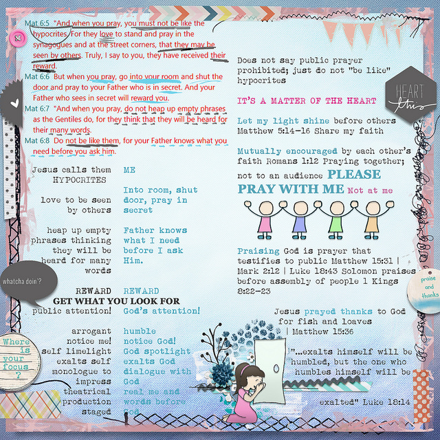 I have been belittled before for writing prayers because I should be only praying in private, so when the Digital Bible Journaling Group's theme was prayer for this month, I wanted to take on the challenge of studying these difficult verses to better understand them. The last thing I want to appear as doing is to share my Christian studies, writings, and prayers to gain attention for myself. I sure hope when I share it is none other than perceived as glorifying God.