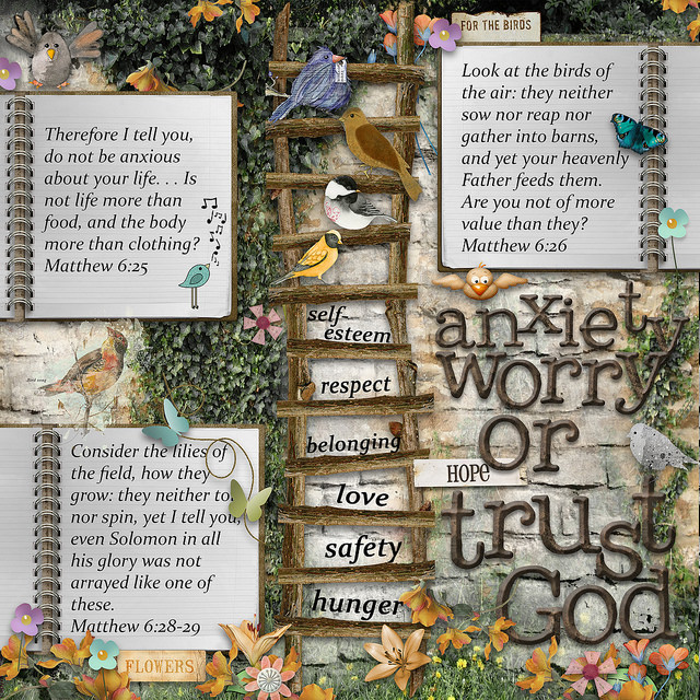 Why are these directions so hard to follow? I know my mind struggles to get rid of worry, even when I know I can trust fully in God. It is my inborn sinful self that causes my faith that He will take care of me and trust in His love to falter. One Hundred Percent faith and trust would leave no room for worry, and yet we do. Worry shows a lack of faith and understanding of God. God does not ignore those who depend on Him. Jesus loves and knows His children and gives us a sense of that when he gives us permission to worry only about today for "sufficient for the day is its own trouble." Take one day at a time.