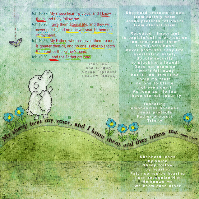 I was further blessed in how three of us had created separately for the monthly theme for the Digital Bible Journaling Facebook group, but how they came together in the layout! The freebies are in the group and we welcome you to join. When I added Bernie's fabulous paper, I realized it mirrored the shape of the hill I had made! Ah! How fun is that! I added my hill and used blending modes to bring out a whole new depth to Bernie's paper. Then I just loved Tara's sheep looking up! It sat on the hill perfectly! The paper is by Bernie; the sheep and flowers (colored by me) were by Tara, and the word art, butterfly, stitching, and hill are by me. I wanted to throw a lot of things on this page, but I am so inspired on two other sheep verses that I have to save some of the goodies for other pages.)