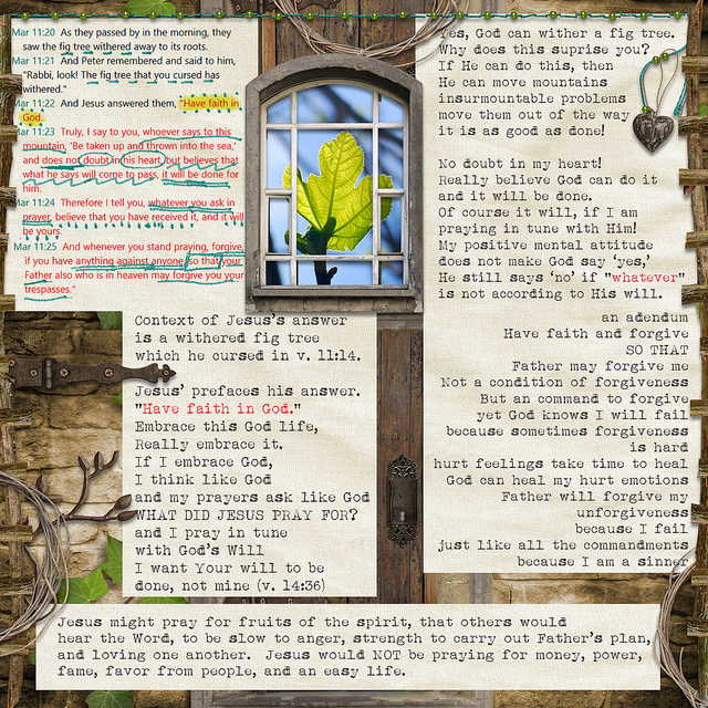 I also have this written in my OneNotes from some time ago on verse 11:25. These are words spoken by Jesus. He tells us to forgive others. Sometimes when the hurt feeling is still there, it is hard to forgive. Sometimes I can tell myself that I have forgiven a person, but cannot make those hurt feelings go away. I must wait on God to heal my emotions and make me whole again. Just because I still hurt, it does not mean I haven't forgiven. Healing just takes time. Read more about having unforgiveness on my layout.)