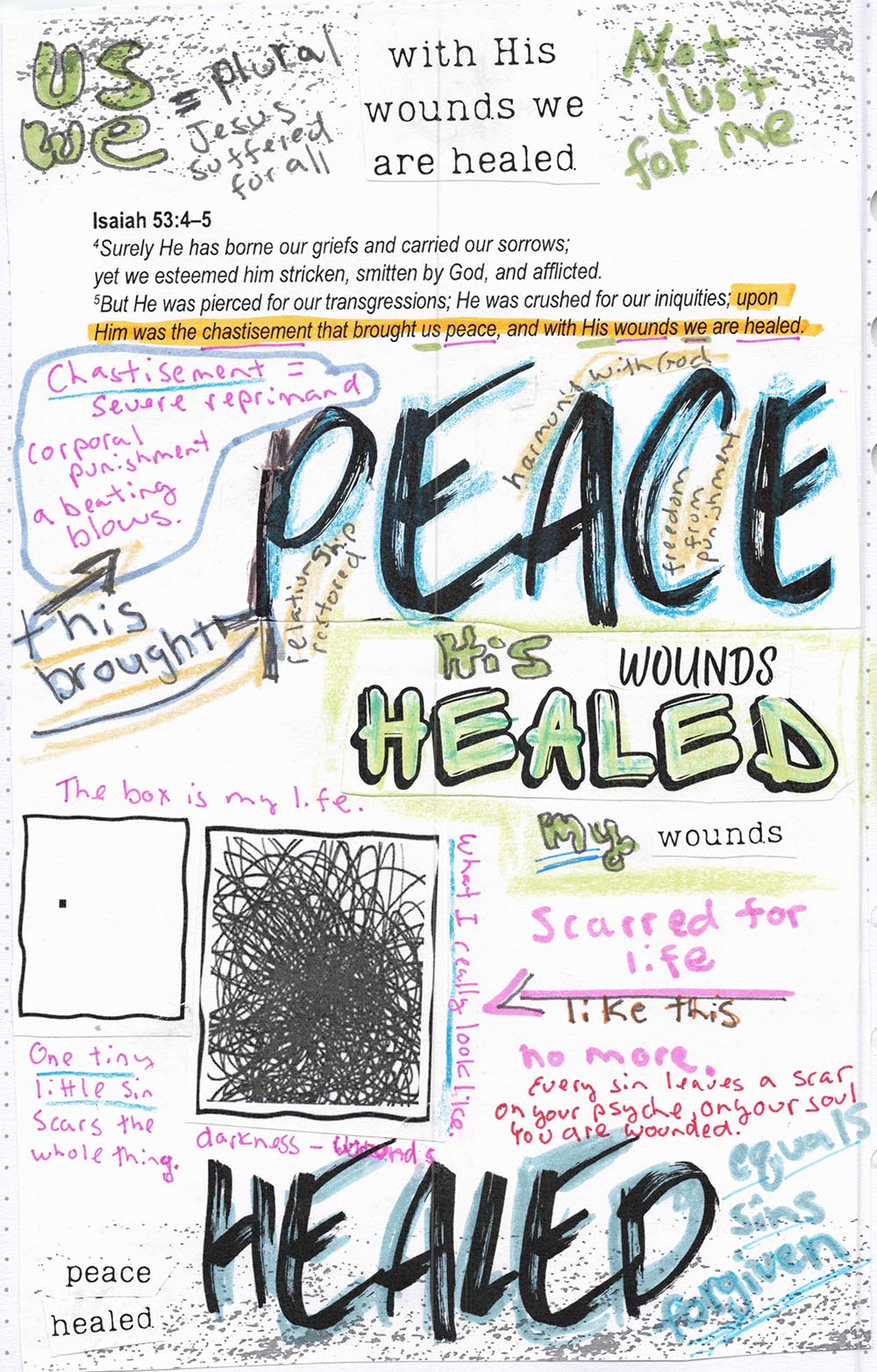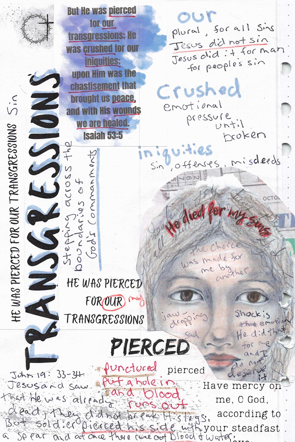 53:5 Jesus was pierced (punctured, put a hole in, and blood runs out) for our (Jesus did not sin, He did it for man) transgressions (stepping across the boundaries of God's commandments); crushed (emotional pressure until broken) for our iniquities (sin, offenses, misdeed); chastisement (beating, blows), His wounds brought peace (a calm heart that knows forgiveness) and we are healed (sins forgiven).