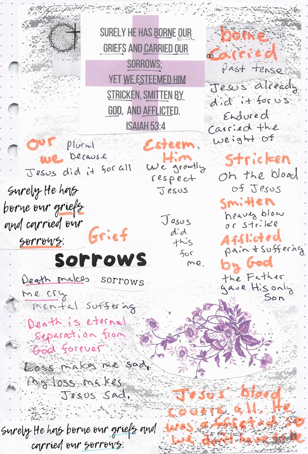 53:4 Jesus borne (past tense, already did for us) (carried the weight of, endured) our (plural because He did it for all) griefs and sorrows (usually for death). Our death (eternal separation from God) was borne by Jesus when He was on the cross. We esteem (greatly respect) Jesus for being stricken (oh, the blood of Jesus), smitten (heavy blow or strike) by God (the Father gave His only Son), and afflicted (pain and suffering). Jesus did this for me. A sacrifice for me. I feel like I might feel if someone pushed me away from an oncoming car to save me from harm while He took the hard strike, blow, all bloody, and full of pain for me. Shock is that emotion. Jaw-dropping. Unable to move a muscle as I look on. Dumbfounded is another feeling because I do not deserve it, yet the choice was made for by another. (dated March 2, 2022, Ash Wednesday)
