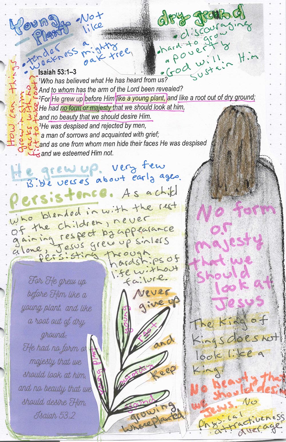 53:2 Young plant (tender, weakness, as opposed to a mighty tree); dry ground (hard to grow; discouraging; poverty; God will sustain Him); no form or majesty (the King does not look like a king); no beauty to be desired (no physical attractiveness)