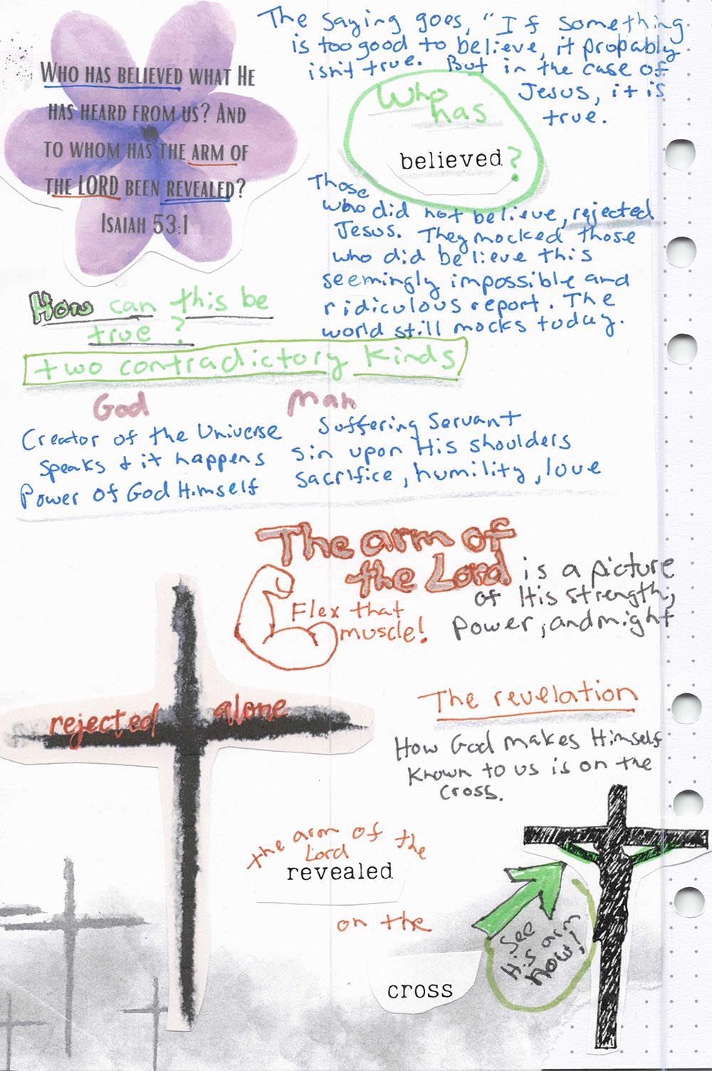 53:1 Who has believed? (Rejection); the arm of the Lord revealed (the revelation, or how God makes Himself known to us, is on the cross) (The arm of the Lord is a picture of His strength, power, and might)