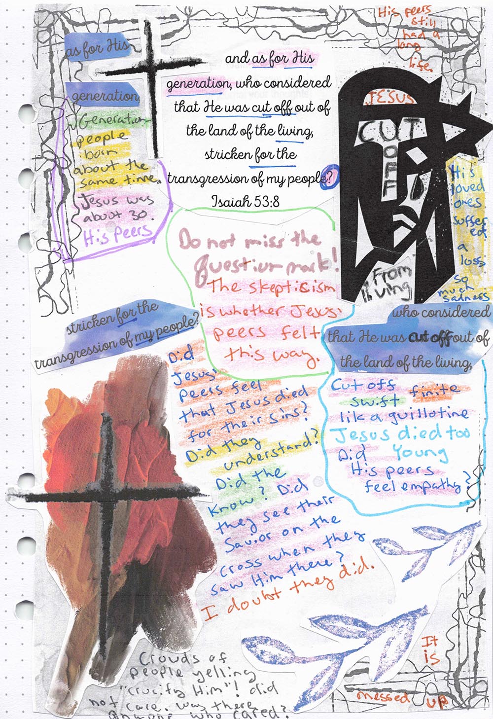 In keeping these notes in context, it is worth noting there is a question mark at the end of verse 8. A generation is all the people born about the same time, usually clumped together by the decade. Tradition is that Jesus was about 30 when He died and His peers still had a long life to live, but Jesus was cut off from that long life. Jesus died too young. I often feel empathy for those who die too young and their loss of what life could have been. Jesus was cut off from those He loved. He was cut off too soon. His friends and family also suffered this loss. The words "cut off" jump out at me as something that is swift and finite like a guillotine. But the question, the skepticism, is whether Jesus's peers felt this way. We can imagine how his loved ones felt, but did Jesus's peers feel he was cut off too soon? We read about the crowds of people yelling 'crucify Him' that certainly did not care that He died too young, but what about the other people? Was there anyone who cared? Did Jesus's peers feel He was stricken for the transgressions of His people, that being, did His peers feel that Jesus died for their sins? Did they understand? Did they know? Did they not see the Savior when they saw Him.