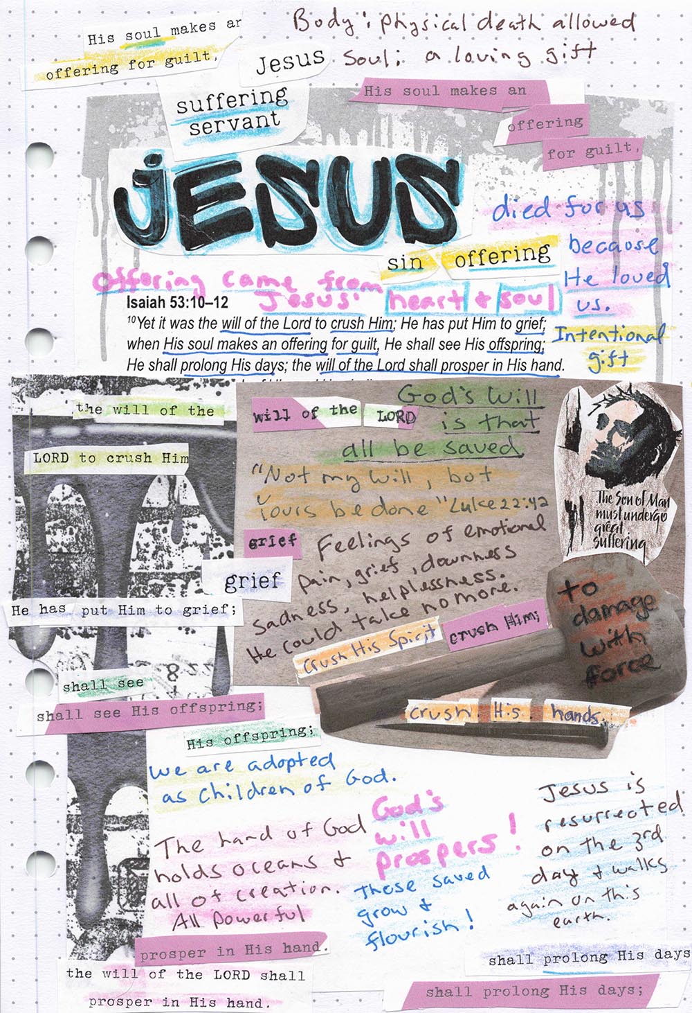 53:10 I see the word "soul" repeated in these verses. Some people say there are three parts to man, that being the body, soul, and spirit, but I believe that there are two parts because the soul and the spirit are the same thing. Why did Jesus have to die? It was God's Will. It was God's plan. It was all God's doing. With knowledge of the Father and the Son as part of the Trinity, it is difficult to read these verses as to who is being referenced, who "he" and "his" reference, or if God as a whole is being referenced. LORD in all caps represents the Hebrew word yhwh (Jehovah or Yahweh meaning "God" or "I am") and Lord in standard form (meaning "my Lord") is the Hebrew word for Adonai. God's Will is that all be saved and the one and only way to accomplish that Will required Jesus to be crushed. It was not only God the Father's Will, but also God the Son's Will. Luke 22:42 “Father, if you are willing, remove this cup from me. Nevertheless, not my will, but yours, be done.” Jesus as man did not want to go through suffering, but Jesus as God had the same Will as the Father. To crush is to break or to damage with force and this makes me think of the nails through Jesus's hand, but the meaning here is more so that His spirit was crushed. Jesus went through so much that His feelings of emotional pain, grief, downness, sadness, helplessness could take no more. A crushed spirit has no ability to be happy. A guilt offering is a sacrifice made to compensate for sins. Here we read that this offering of a sacrifice must come from His soul. I read this as the offering had to come from Jesus' "heart and soul." He did not just die because the crowd had him put on a cross. He died for us because of His love for us in His heart. He did this for us. The physical death was allowed but the death of His soul was a purposeful gift. Jesus will see His offspring in that we are adopted as children of God. Jesus shall prolong his days when he is resurrected on the third day and walks again on this earth. The Will of the LORD prospered (was successful, grew, flourished) in His hand. The Apostles Creed, "“He ascended into haven and sits at the right hand of God the Father Almighty.” The hand of God holds the oceans and all of creation. God's hand is powerful and it is only at God's hand that His Will is successful. The right hand saves as in Psalm 98:1 and it accomplishes the work of reconciling the world to Himself.