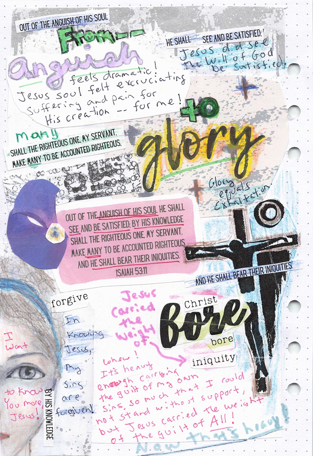 53:11 Out of anguish of His soul, Jesus did see the Will of God be satisfied. The word "anguish" feels dramatic as we do not use the word often. Jesus's soul felt excruciating suffering and pain. He felt that for His creation, for His children, that is, Jesus felt that for me. Jesus is the only righteous One, and as the Suffering Servant who bore the sins of all, many are accounted righteous. By His knowledge (in knowing Him), my sins are forgiven. Jesus bore, that is carried the weight of, the iniquities of the world. Whew! It's heavy enough enduring the weight of my own sins so much that I could not even stand on my own without support, but Jesus carried the weight of the guilt of all. Now that's a heavy load!