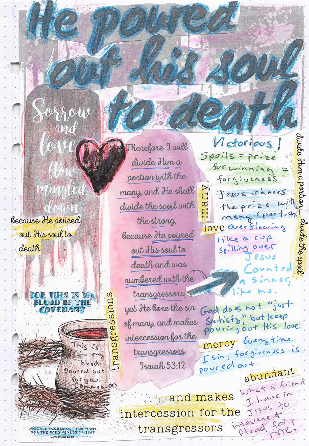 53:12 After a battle, the victorious goes about taking as their own the spoils. The spoils of war are anything of value that can be found and taken as a prize for winning. It is a legal "finders keepers, losers weepers" childhood phrase. Anyone and everyone can take a portion of whatever they can find. The spoils of the victory of Jesus's death are the forgiveness of sins and the prize is divided with many (the strong). Many is not descriptive enough thinking on how many throughout all time get to share in the prize of forgiveness. This was not teamwork of an army winning, but the actions of One who won the prize for all, like a saving hero. I did nothing to win the prize and yet Jesus shares it with me! The reason I am able to share in the prize is because Jesus poured out his soul to death as He was counted a sinner like me, even though He never sinned. I love the imagery of God's love overflowing like liquid filling a cup to the brim and then spilling out all over. Psalm 23 says "my cup runneth over." God does not "just satisfy," but keeps pouring out his love. Every time I sin, He continues to love and forgive me poured out from His soul. Jesus makes intercession for transgressors. What a friend I have in Jesus to intervene and plead for me! Only Jesus could have that kind of influence on God the Father.