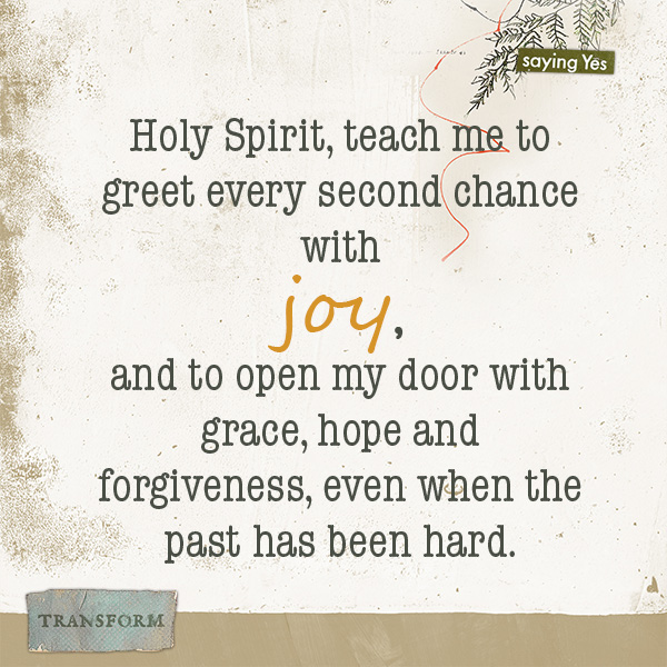 Please pray with me: Holy Spirit, teach me to greet every second chance with joy, and to open my door with grace, hope and forgiveness, even when the past has been hard. Help me find joys hidden inside the hard moments. Amen.