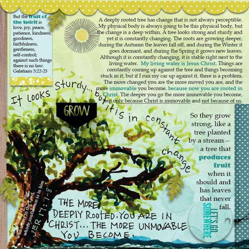 I created this layout after listening to the Visual Faith Ministry, "The Movable Adventure,' first Bible Study on Romans 12:1-2. These Bible verses focus on the process of sanctification. There was a wonderful discussion about Psalm 1 with the analogy of a tree planted by the stream of water. The year-long theme is about transformation and making a moveable adventure while studying God's Word. What a great imagry of how when we are rooted in Christ, the Living Water, we become more like Christ as we are sanctified and, thereby become more immovable like Christ. Of course, Christ is the one and only immovable One, and we will never attain that state this side of heaven, but we can become more solid and stable in our faith. The year-long program gives many resources and one such resource are sketch notes. The tree graphic in my digital Bible journaling is credit to Janet Blotcher at skirtfarmerstudio.