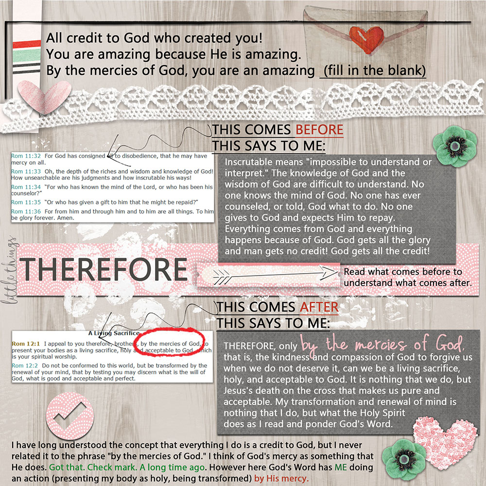 this graphic focuses on the words "by the mercies of God." The graphic says it all and so there is no need to repeat it in writing. It is all about God. Everything I do is all credit to God. It is only by the mercies of God that I do what I do. This is the first commandment of keeping God first. See the companion graphic for 1 Corinthians 8:1-3 about moral deism which is a new trend in today's world quite opposite of keeping God first and instead focusing on self.