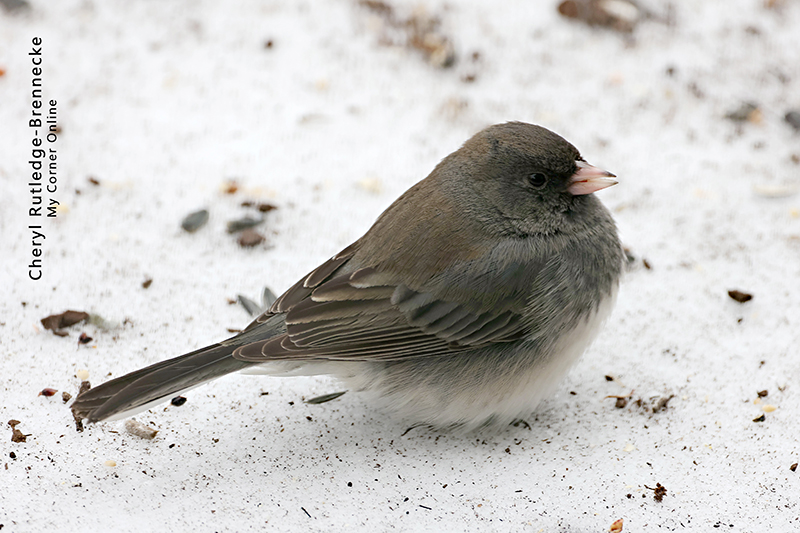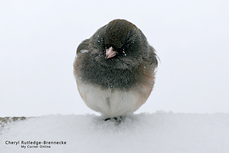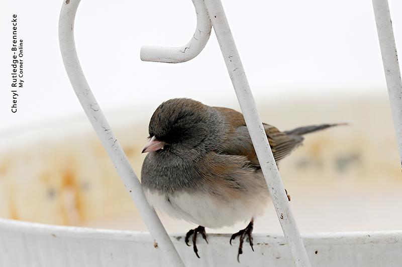 #4 of 11 birds in my snowy garden is the Junco. They are a favorite of mine and show up only in the cold months. I like them for a lot of reason. They are so small and yet so strong as they hold their own around the other birds. They are brave and rarely intimidated by other birds, kind of like I wish I were. I love white and the contrast between their white bellies that get lost in the snow and their grey backs is something I find pleasing. I like that the male and female are not so different as that represents equality. They do not hoard the feeders, but rather wait patiently hopping around on the ground to eat what has been left for them by the other birds. I love they way they hold onto upright sticks and stand so confidently. I love how they twist their heads to look around without moving their body. I love that they visit my garden all day long and not just in the morning and dusk. I love that they are kind birds, never fighting with each other or other birds. They manage to exist in a world with fragments of ugly and never waiver from who they are. Do you see why I like them so much, beside the fact that they are just adorable? February 2025