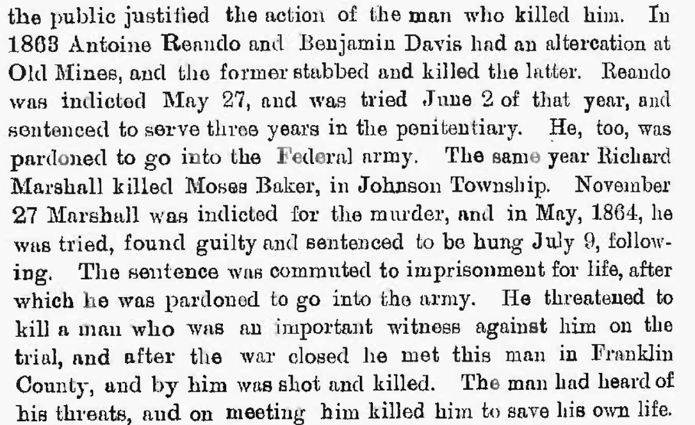 In the book, History of Franklin, Jefferson, Washington, Crawford & Gasconade Counties, Missouri, Page 501, the Goodspeed Publishing Co, 1888, we find our ancestor in print with several errors. First, he did not kill Moses Baker, but rather David Baker. Second, we see the history that has been passed along that he was pardoned to go into the army (i.e. civil war). The Civil War was from Apr 12, 1861 – May 9, 1865 and he was pardoned in July 1867 and killed just weeks thereafter in August 1867. The truth as we have found out is that he was pardoned because of his service to the jail and his good character. It would seem that Smith Jackson's family was interviewed by Westin Arthur Goodspeed and that is where he received his false information.