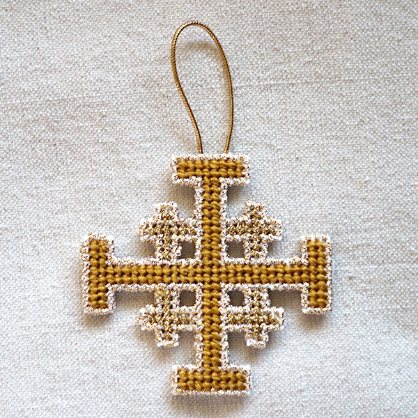 This is the Jerusalem cross. Sometimes it is called the Crusader's cross. This cross has many meanings. The first meaning is that the center cross is made by joining four Tau crosses. The four smaller crosses represent the four Gospels. It can also represent the Christian mission to tell everyone of Jesus, with the large cross standing for the church at Jerusalem and the four small Greek crosses standing for the four corners of the earth. Another meaning is that the five crosses represent the five wounds our Lord suffered at the crucifixion-the large cross for the wound in His side and the smaller crosses for the wounds in His hands and feet.