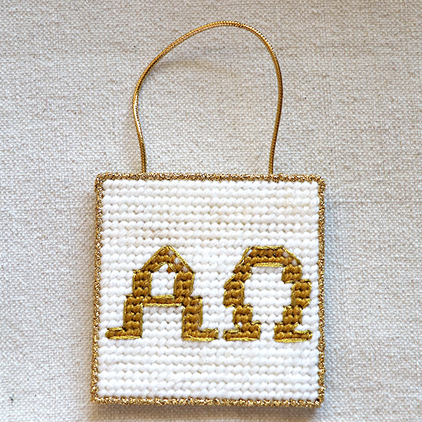 We call this Chrismon the Alpha and the Omega. These are the first and LJ the last letters in the Greek alphabet, and as such they symbolize that Christ is the beginning and the end of all things.