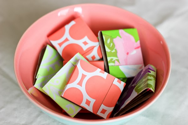 I saw these matchbook covers and normally, since I do not smoke, I would have looked right over them. However, I got to thinking about how I have lighters around the house to light my candles, but hubby prefers matches, and how simple of an idea this would be to bring little pops of color and fun to a room.