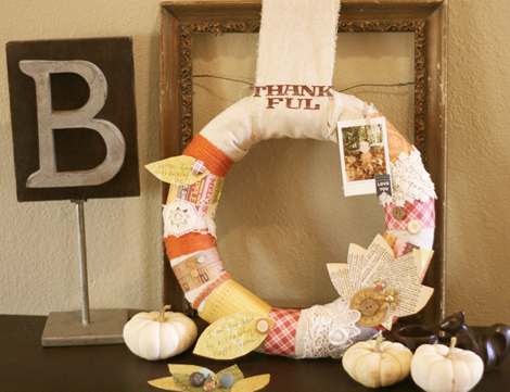 I am loving the inspiration of this wreath! These are papers, fabric, lace, and other things from around the house wrapped on a canvas wreath. I can see printing my own digital scrapbooking papers to wrap this wreath with (as a hybrid project). The idea of changing up a wreath to go with the seasons, much like I change up the curtains, rugs, blankets, and pillows in my home with the seasons, I could change up a wreath. Kind of a cool idea. A gift could even be made of the idea by cutting up strips of scrap fabric for all seasons, along with other tidbits to decorate it, and putting it in a cute storage box.