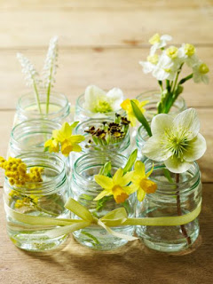 I love this! These could be jars collected from jams and jellies, tied together with a simple bowed ribbon. I like that there is one or two flower in each jar and that the whole theme is yellow. A matching ribbon could be used for whatever flowers you are using. Wouldn't it make a great table decoration for guests?
