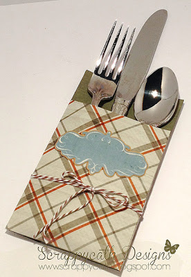 I saw this awesome hybrid idea to use digital scrapbooking papers for a silverware holder. What a cute way to dress up a table, uh? Click on the image credit to read more. She even has a pattern download available.