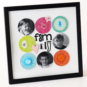 Create the circles with digital scrapbooking, print them out, and frame them with photos cut into circles.