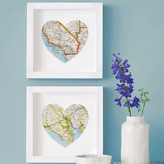 I recently took down a tapestry in my bathroom, which I loved, and gave it away as a gift. (first posted 11/12/11) I'm considering new ideas for the wall space and found this to be simple and meaningful. The heart could be cut from any white paper. The maps are a neat idea behind the heart, but I am wondering if I could change out the piece behind with other ideas.