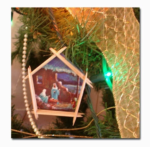 This ornmanet is merely toothpicks glued to each other (gluing around circular) with a cut out of a Christmas card in the middle. I had saved previous year's Christmas cards and allowed the children to choose whatever photo they wanted. Of course, I thought the nativity scene looked most appropriate.